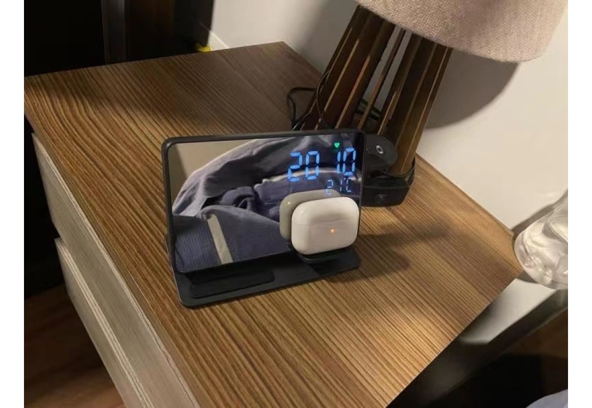 Com entrada PD/QC de 18W, oferece carregamento potente de até 15W para celulares, além de base dedicada para AirPods (5W) e Apple Watch (3W). A tela conta com ajuste de brilho, garantindo conforto durante o dia e à noite.